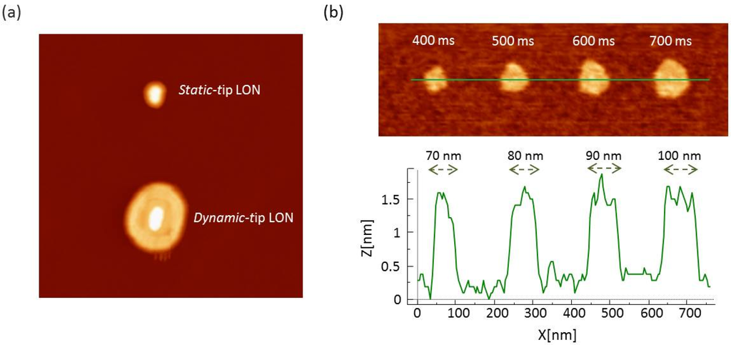 (a) Topography image of two dots performed by static-tip LON (top) and dynamic-tip LON (bottom) at the same oxide conditions: dts = 15 nm, Vox = −35 V, tox = 100 ms. Image size: 2.9 µm × 2.9 µm; (b) Topography AFM image of an array of oxide dots performed with static-tip LON at a constant voltage value of −42 V and with increasing pulse durations (dwell time step increment is 100 ms). Height profile measured along the line in (b). Image size: 900 nm × 300 nm.