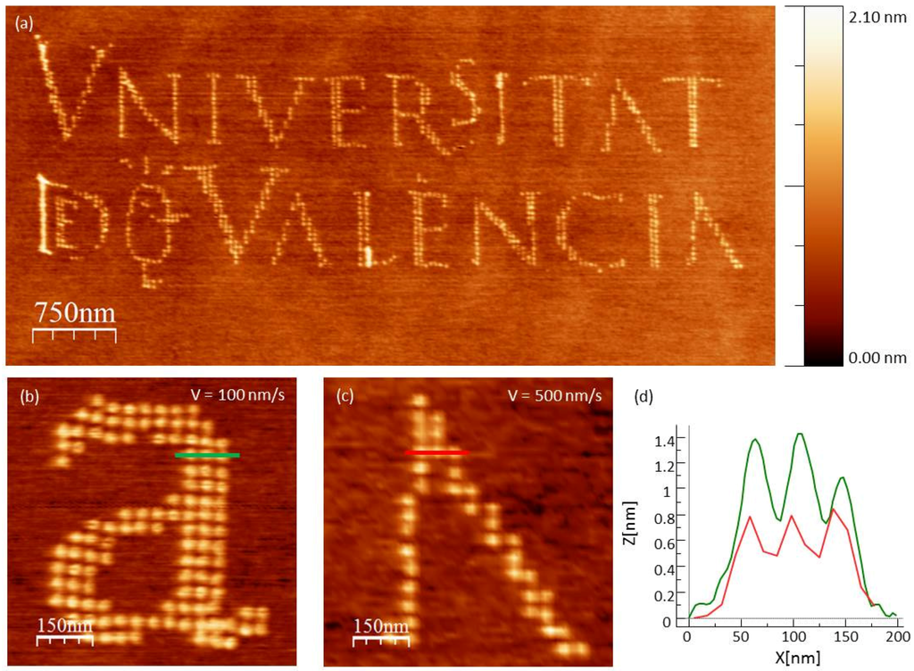 Finally, it was also found that the oxidation performed at lower scan speeds produced higher oxide motifs than the ones obtained scanning at faster speeds. A height profile taken in Figure 4b (performed at v = 100 nm/s) and 4c (performed at v = 500 nm/s) is shown in Figure 4d, where it can be clearly seen that the faster scans give rise to lower dots than the slower scans.