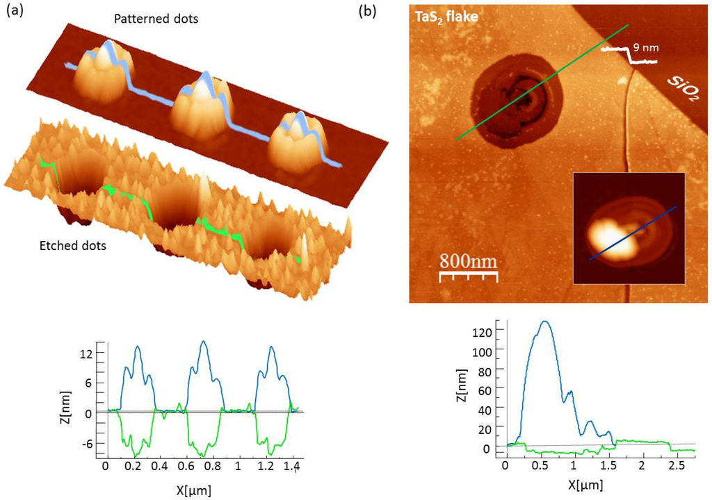 (a) Etching on a thick TaS2 layer (bulk). 3D topography image of an array of three oxide dots created at −22.5 V and 45 ms (top) and the same three HF etched oxide dots (bottom). Images size: 1.7 µm × 480 nm. Below, the corresponding profiles for both images pristine (blue) and etched (green) oxide mounds are shown; (b) Etching on a thin layer (9 nm). AFM topography image of an etched oxide rippled dot on a TaS2 layer. Inset: AFM topography image of the oxidized dot fabricated at −27 V and 100 ms. Bellow, the corresponding profiles for both, oxidized (blue) and etched (green) motifs is shown.