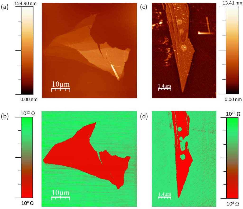 (a) AFM topography image measured in contact mode of a TaS2 flake; (b) CT-AFM resistance mapping of the same flake; (c) AFM topography image of TaS2 thin flakes; (d) CT-AFM resistance mapping of the patterned flake shown in (c).