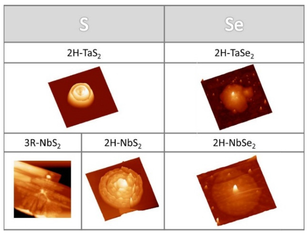 Table for summarizing the oxide growth formations through dynamic-tip LON onto the different exfoliates layers of the five types of TMCs studied: 2H-TaS2, 2H-TaSe2, 2H-NbSe2 , 2H-NbS2, and 3R-NbS2.