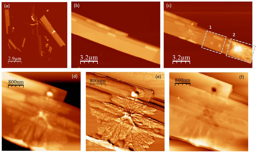 During the exfoliation process of NbS2 crystals, it was observed that the characteristic TMDCs platelet-like flakes were mixed with needle-like stacks. From the transmission electron microscopy analysis of these needles, we could infer the rhombohedral phase 3R of the NbS2 (for detailed characterization see the Supplementary Materials S1). The local oxidation of this new system gave rise to a unique case of dendritic oxide growth (Figure 8a,b). Instead of the expected rippled mounds, dendritic shaped oxides that formed a fractal pattern were obtained on the needle. A range of oxidation parameters were utilized to create different sizes although all of them appeared to have the dendritic structure. While applying less voltage and shorter time pulses, the formations obtained were more rounded and smaller in size (Figure 8c-1), very high voltages (> −30 V) applied during 100 ms or more, derived in an uncontrolled oxide branched formation that grew several microns all over the surface until reaching the limits of the needle (Figure 8c-2). As observed for the rippling formations, the dendritic oxides always stopped at the edges of the crystal. The experiment was repeated in different needle-like stacks of 3R-NbS2 and always a dendritic growth was obtained (Figure 8d–f). The dendrites have a central circular spot just right below the site were the AFM tip makes the discharge and then, it seems to evolve through avalanches like the ripple formations of the rest of the TMDCs studied. This anomalous structure could be due to an oxidation process taking place across the planes in the needle-like exfoliated crystals. Etching experiments were carried out to ascertain the 3D nature of this type of oxide formations. As can be seen in Figure 8f, the etching reveals a 3D pattern that grew deep inside the 3R-NbS2. In this case, the 50% of the oxide grows above the substrate baseline.