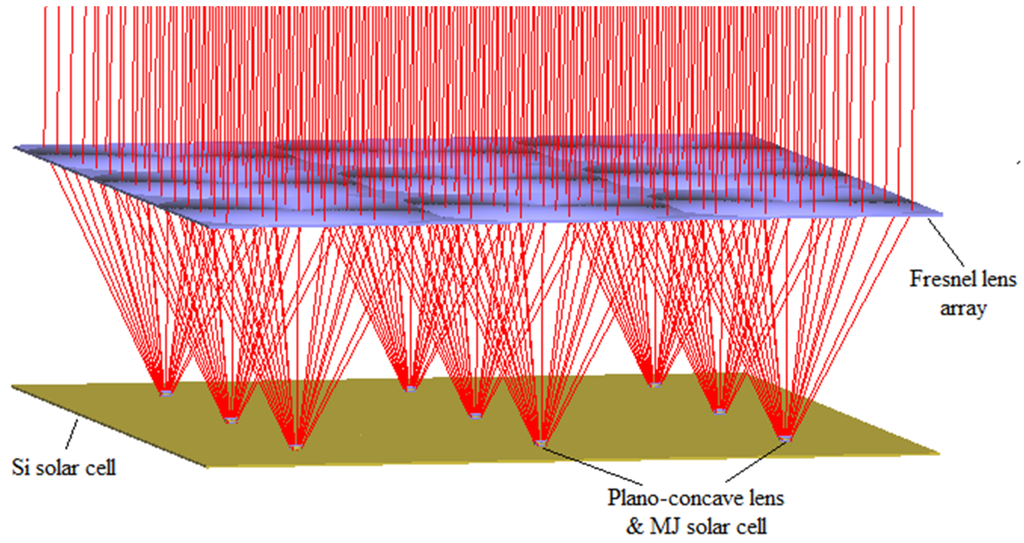 The layout of the proposed CPV system with the array of nine CPV units and the additional Si solar cell is shown in Figure 2. In the design, direct sunrays are concentrated by the Fresnel lenses and redirected and distributed uniformly by the plano-concave lenses on the MJ solar cells. Diffuse sunrays from the sky and through the Fresnel lenses are then collected by the additional Si solar cell. Additionally, direct rays that are hit outside the Fresnel lens region are also captured by the Si solar cell.