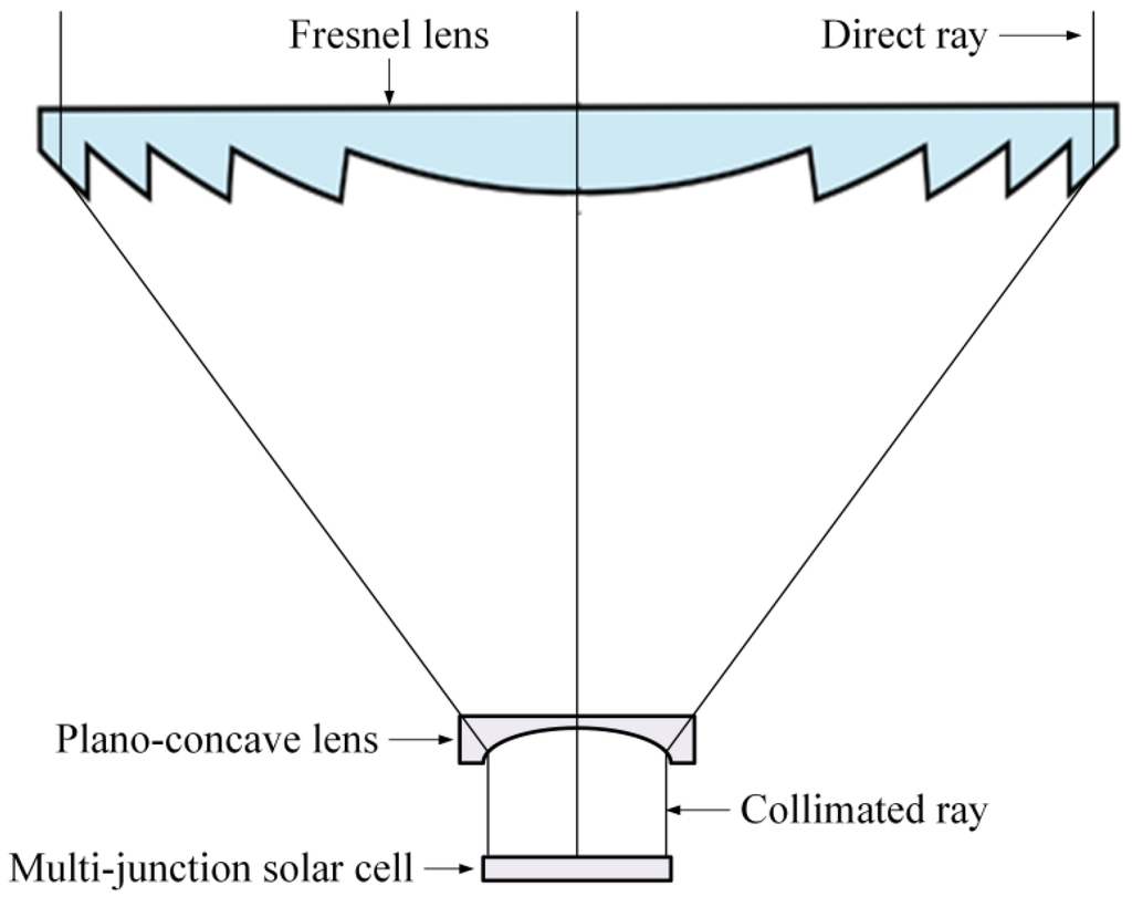 In our proposed system, the material used for the Fresnel lens is polymethyl methacrylate (PMMA) with a refractive index of 1.494. The material used for the plano-concave lens is borosilicate glass N-BK7 with a refractive index of 1.52. Table 1 summarizes the design parameters of the CPV unit.