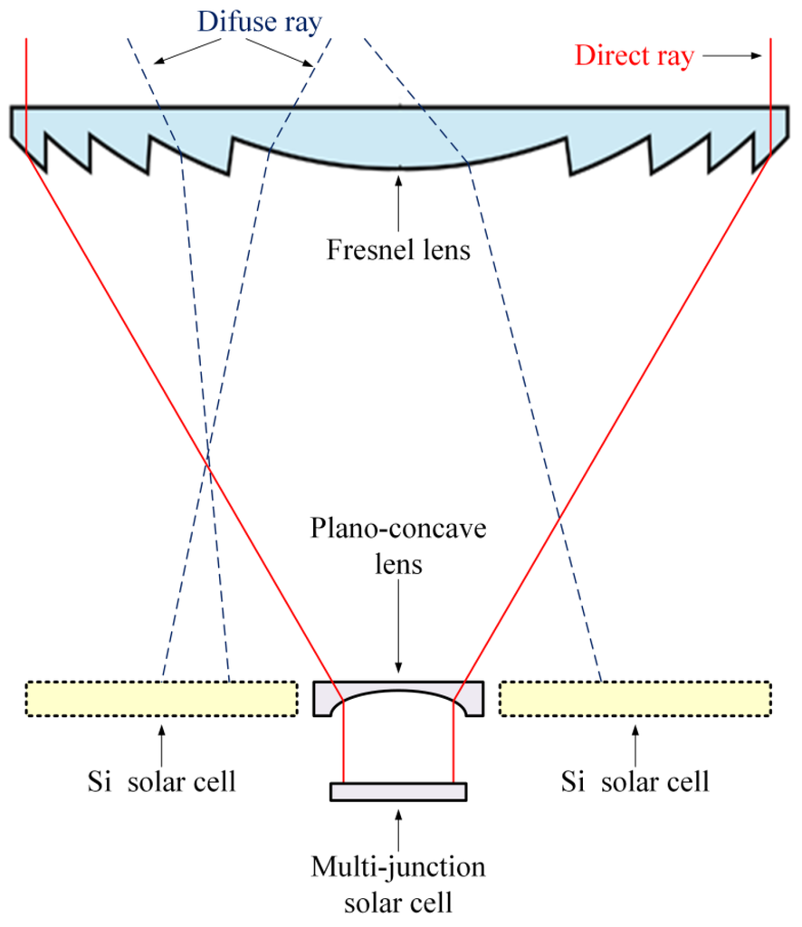 Additionally, CPV systems cannot capture diffuse solar radiation because of the narrow acceptance angle of the concentrators, so the use of the systems in regions of medium direct normal irradiation (DNI) is not cost effective [28]. In other words, the CPV systems are not suitable for medium DNI regions, such as Korea and Japan. Benitez et al. [29] proposed and invented a CPV system that uses auxiliary cells to collect diffuse solar radiation. The invention comprises a combination of two types of solar cells in a single module. The main cell is located at the focal spot of the concentrator and a low-cost secondary solar cell is added to the concentrator, surrounding the main cell. Direct solar radiation is concentrated upon the main cell, while diffuse solar radiation is collected by the low-cost secondary solar cell. This concept was implemented in [28,30] using a prototype CPV module with an additional cell. In the implementation, a silicon solar cell was installed onto a CPV module. In this experiment, direct solar radiation is concentrated by a Fresnel lens onto a triple-junction solar cell, whereas diffuse solar radiation is collected by the additional solar cell. The experimental results showed that the electricity generated by the experimented CPV module with the additional crystalline silicon solar cell is greater than that for a conventional CPV module by an improvement factor of 1.44 when the mean ratio of diffuse normal irradiation to global normal irradiation is 0.4. In other words, the experimental results showed that the experimented CPV module provided a conversion efficiency increase of 44% compared to the conventional CPV module. Therefore, the CPV system with the additional solar cell improves the system efficiency compared to the conventional CPV systems, especially in medium DNI regions.