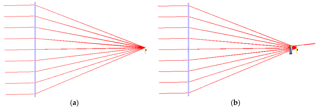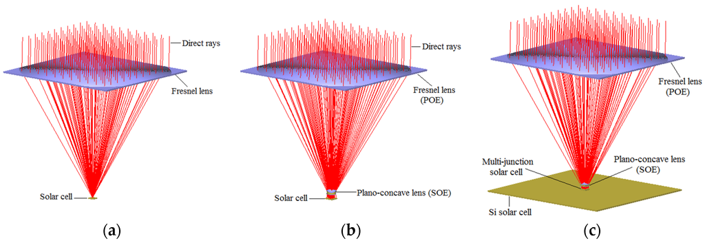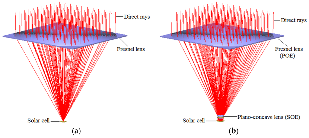 Ray-tracing layouts of the conventional CPV unit and the proposed CPV unit with the SOE are shown in Figure 6a,b, respectively. In the proposed CPV unit, the POE concentrated and focused direct sunrays on the SOE’s surface, and then the SOE distributed the sun rays over the solar cell uniformly, as shown in Figure 6b.