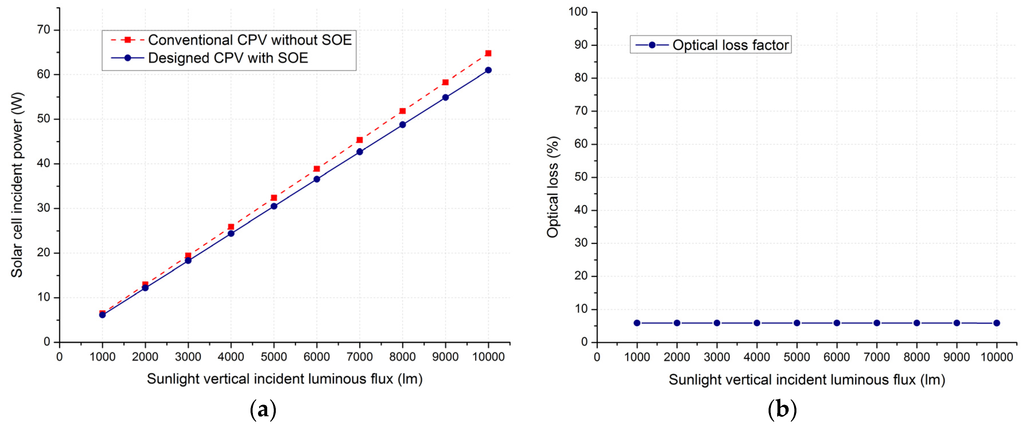 Several simulations were conducted with various sunlight vertical incident luminous flux values to evaluate the loss factor of the proposed CPV unit. The incident power received at the solar cell was recorded in the simulations. Figure 8a shows the incident power received at the solar cell of both conventional and proposed CPV units, and Figure 8b shows the optical loss of the proposed CPV unit compared to the conventional CPV unit. The simulation results showed that the loss factor of the proposed CPV unit was 5.86%. In other words, the proposed CPV unit with the SOE resulted in optical loss of 5.86% compared to the conventional CPV unit without the SOE.