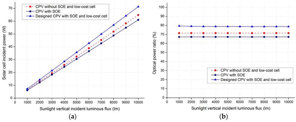 (a) comparison of incident solar power received at the solar cells of CPV units; and (b) comparison of the optical power ratio between CPV units.