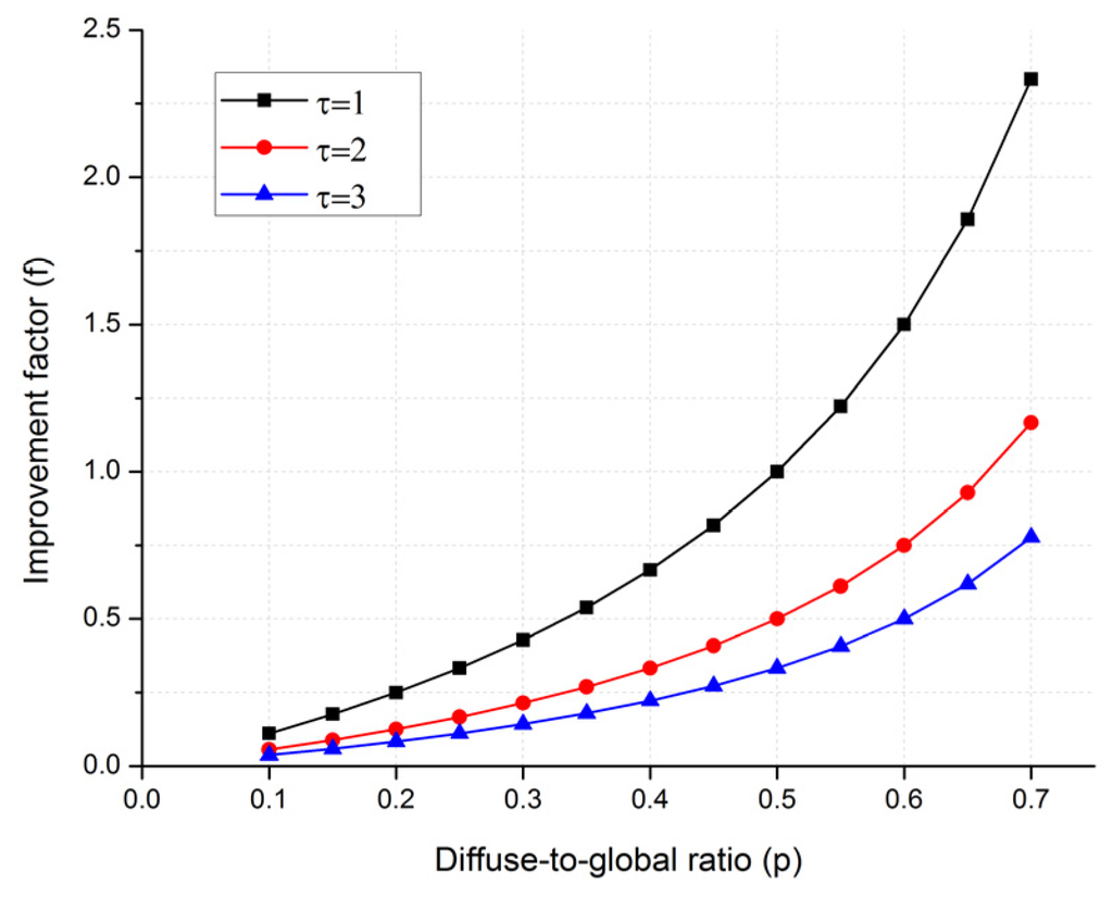 Figure 13 shows the improvement factor values for seven values (0.1 0.7) with , 2, and 3, respectively. For , an improvement of 33.3% is expected for a medium DNI region with , whereas an improvement of 12.5% is expected for a high DNI region with .