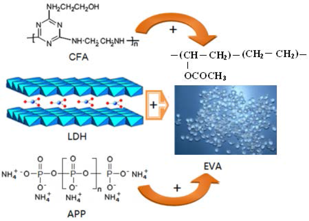 Schematic representation of CFA (charing-foaming agent)/APP (ammonium polyphosphate)/LDHs (layered double hydroxides) and EVA (ethylene vinyl acetate).