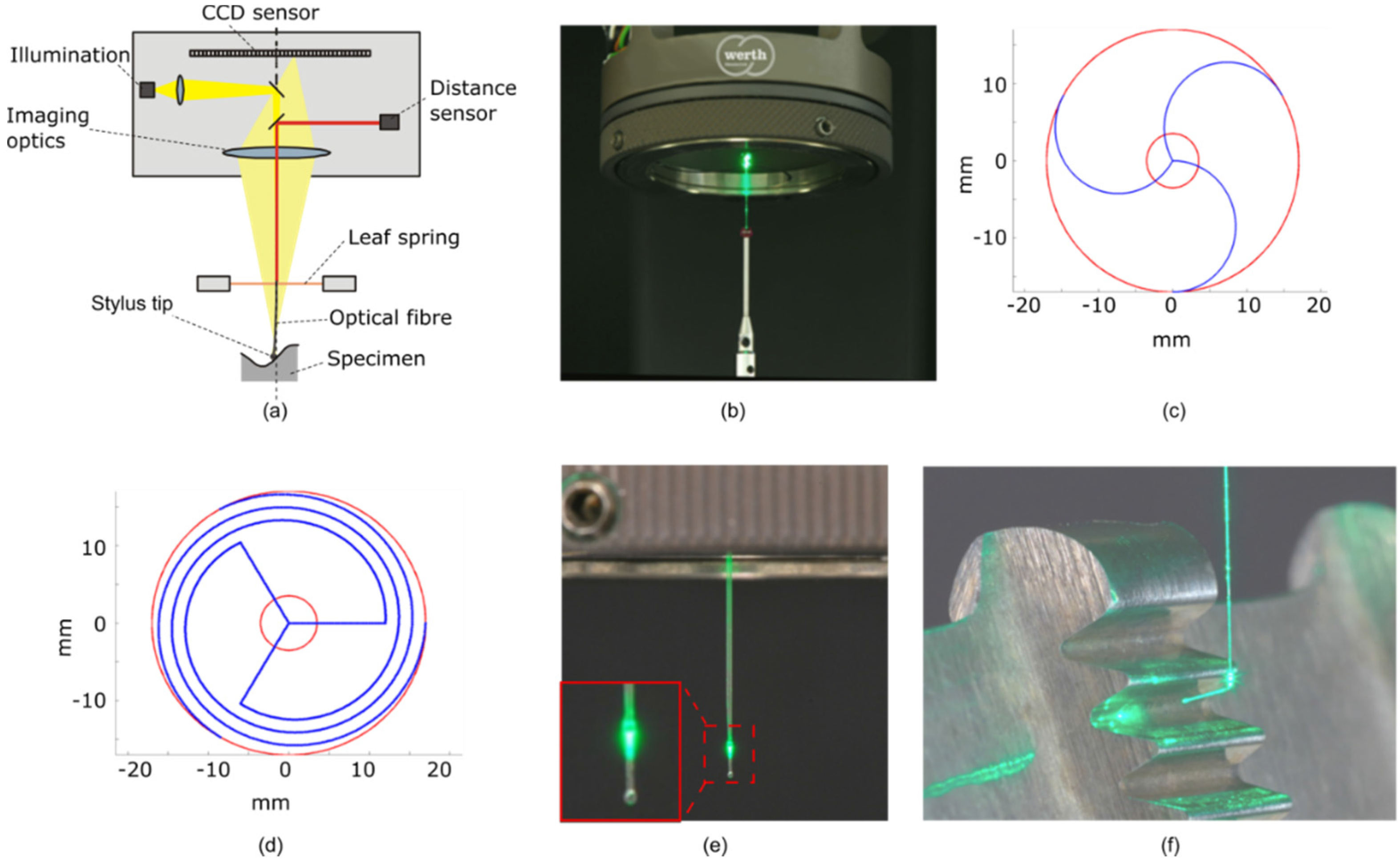 Figure 3. (a) Schematic diagram showing the measurement principle of a 3D fibre probe; (b) photo of a 3D fibre probe measuring a ruby sphere (Ф 2 mm); (c,d) the designs of the leaf spring before and after improvement, respectively; (e) an alternative design with a dual-sphere stylus; and (f) an alternative design with an L-shaped stylus [25].
