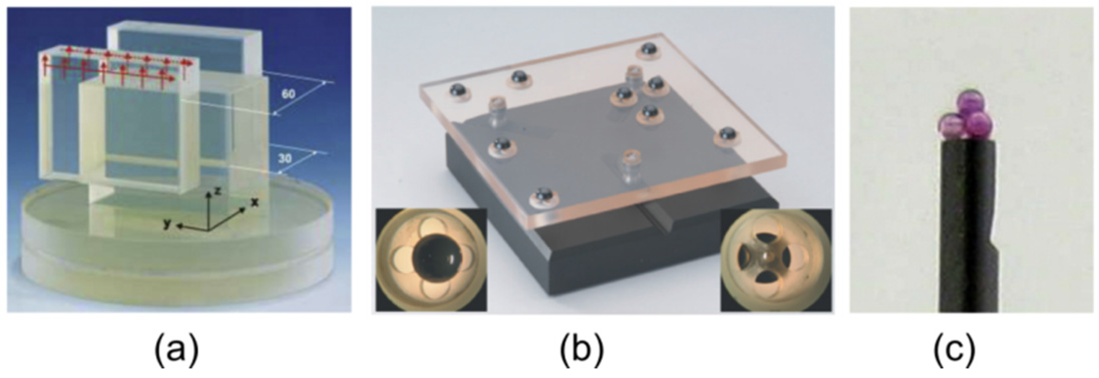 Figure 8. Photos of several geometry calibration standards for micro-CMMs, shown as: (a) a Zerodur gauge block bridge; (b) a ball plate with nine hemispheres made of silicon nitride manufactured by Carl Zeiss IMT; and (c) a micro-tetrahedron artefact consisting of four spheres with (Ø 0.5 mm).