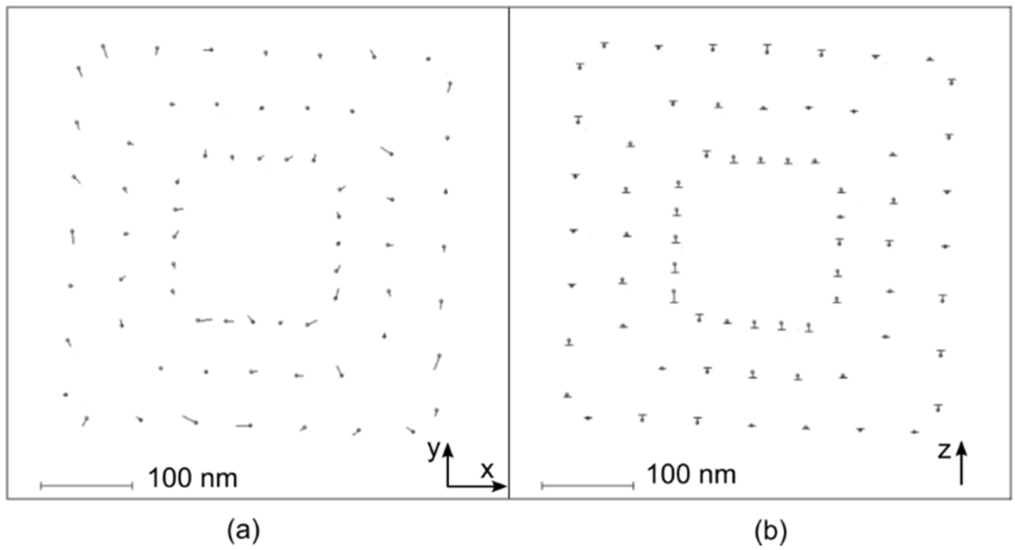 Figure 10. Measurement repeatability of mark coordinates measured on a 3D Aztec artefact by the PTB NMM equipped with a boss-membrane probe. The artefact is calibrated in two repeated measurement runs. The difference of the results is shown as vectors: for the x- and y-coordinates (a); and for the z-axis (b). The scale of the vector is shown in the bottom left region of the plot.