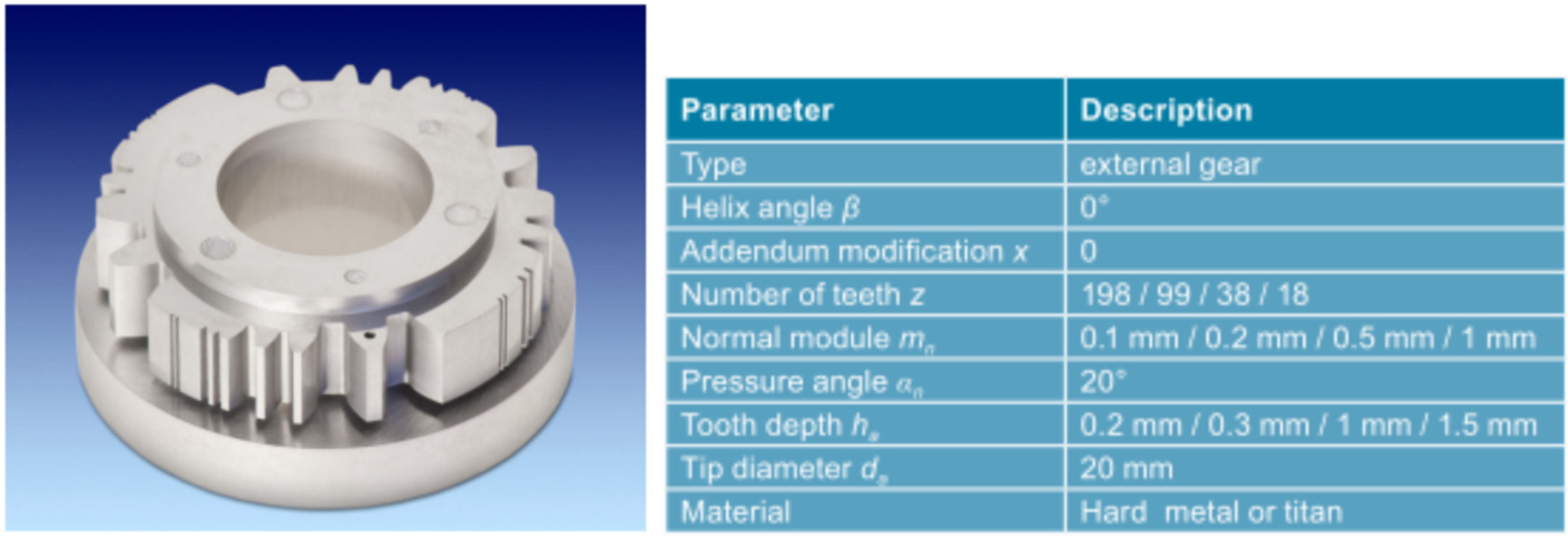 Figure 12. Photo of a workpiece-like microgear measurement standard (tip diameter: 20 mm, module 0.1 to 1 mm) developed at PTB. The design parameters of the standard are shown in the table.