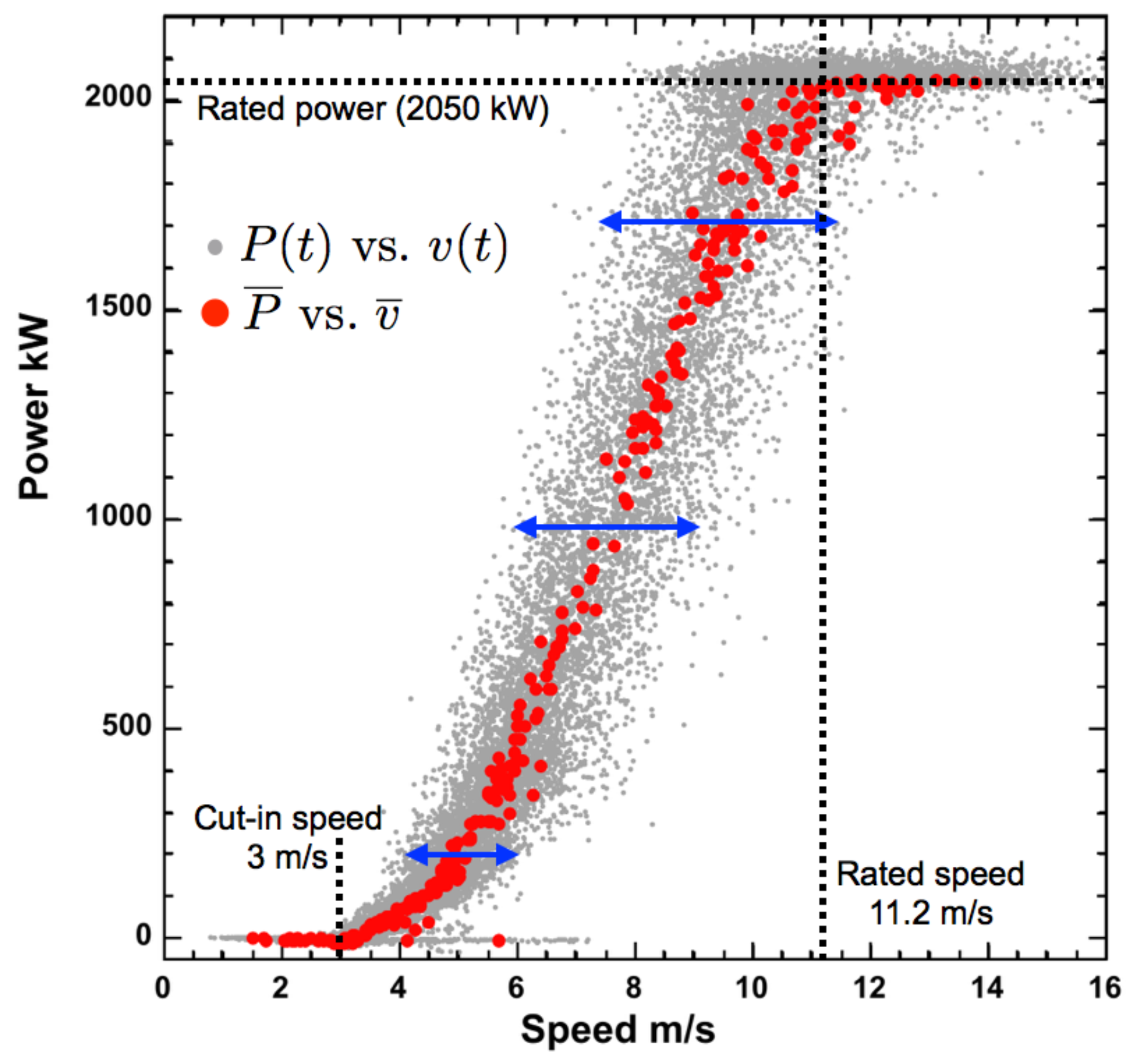Instantaneous power versus instantaneous wind speed (solid grey circles) and time-averaged power versus time-averaged wind speed (solid red circles) for the Howard data set (Table 1). Considerable scatter in versus occurs about the time-averaged power curve. The scatter increases with mean speed , as qualitatively shown with blue arrows at 5, 7, and 9 m/s.