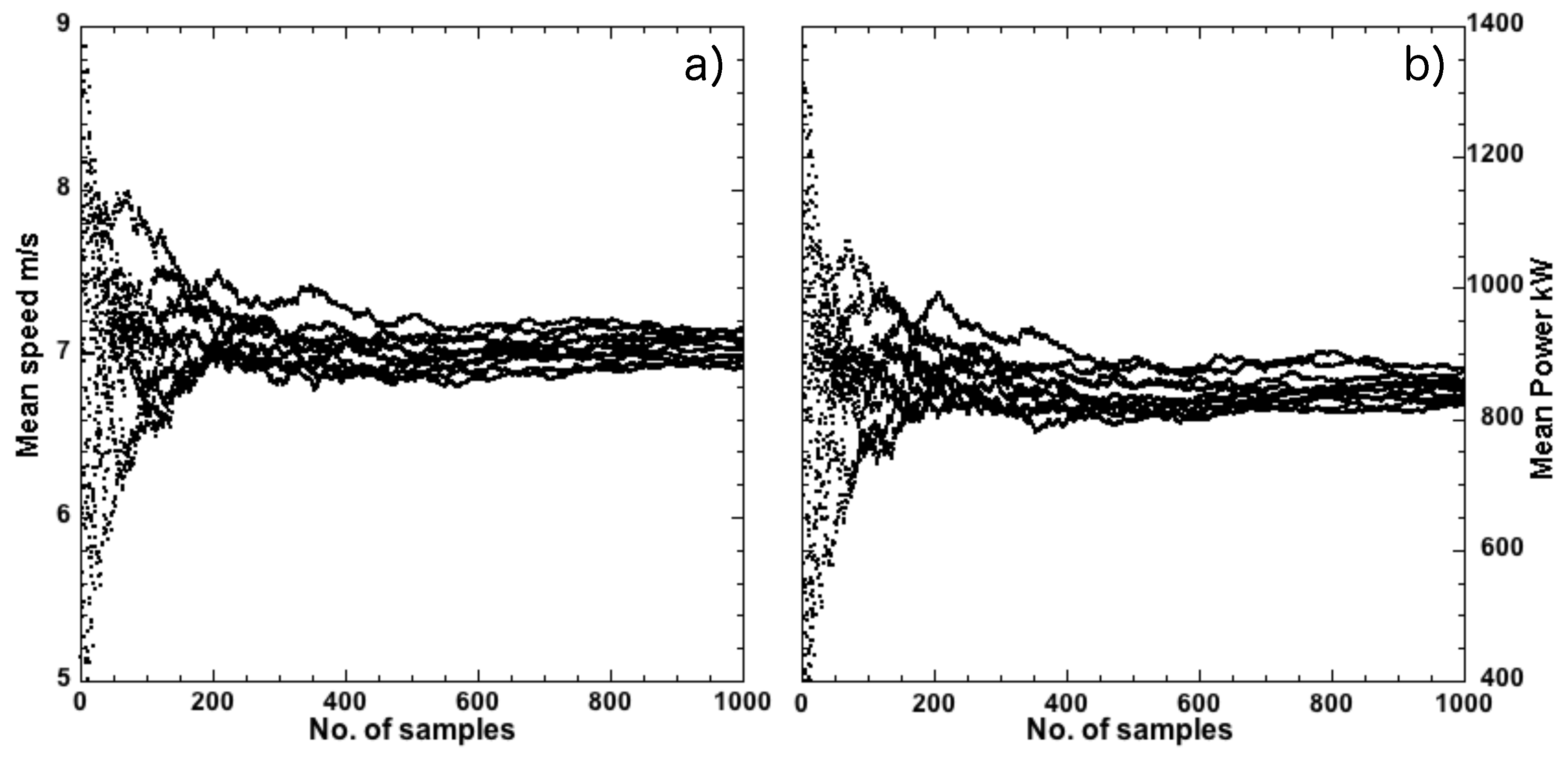 Statistical convergence of (a) mean wind speed; and (b) mean wind power versus number of samples contributing to the average. Each trace represents a separate data set generated with a bootstrap protocol by randomly shuffling values of the original Howard time series (Table 1). The averages approach asymptotic convergence around 400 samples.