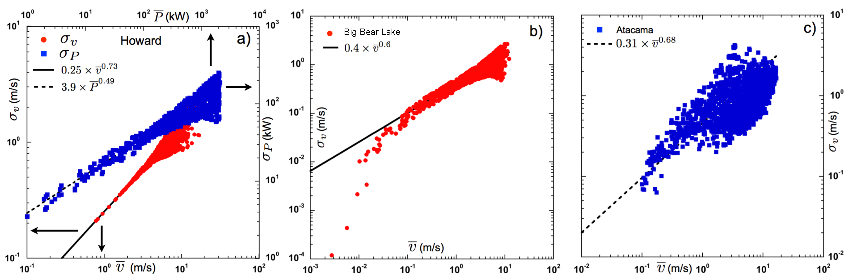 (a) log–log scale: The standard deviation of wind speed fluctuations (red solid circles) versus mean wind speed and the standard deviation of wind power fluctuations (blue solid squares) versus mean wind power for the Howard data set. Power-law fits to the data provided (solid line) and (dashed line); (b) Whereas vs. for Big Bear Lake (red solid circles) exhibits power-law scaling with a fit value of (solid line); and (c) the Atacama data set (blue solid squares) reveals a monotonic increase in vs. . Although we include a power-law fit (dashed line) for illustrative purposes, the scatter in the data does not permit one to place any confidence in the fit value of the exponent.