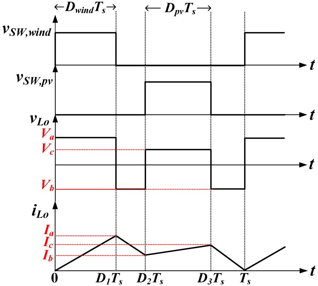 Conceptual waveforms of gate signals and output inductor voltage and current are illustrated in Figure 6, in which the switches SW1,wind and SW2,wind are closed for DwindTs and SW1,pv and SW2,pv are closed for DpvTs, respectively. Since the voltage ripple at each capacitor is much less than the average capacitor voltage, the voltage across the output inductor can be regarded as constant under all switch statuses. Accordingly, the current flowing through the output inductor will be piecewise linear over one switching cycle. The derivation of the output inductance of the DIPWC is sophisticated. For a clear description, the related procedure is summarized as follows.