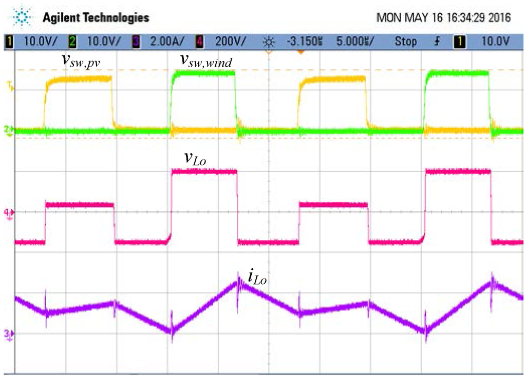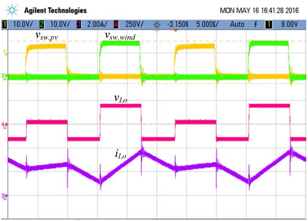Measured waveforms while the output power is 500 W (vsw,wind: 10 V/div, vsw,pv: 10 V/div, vLo: 200 V/div, iLo: 2 A/div, time: 5 μs/div).