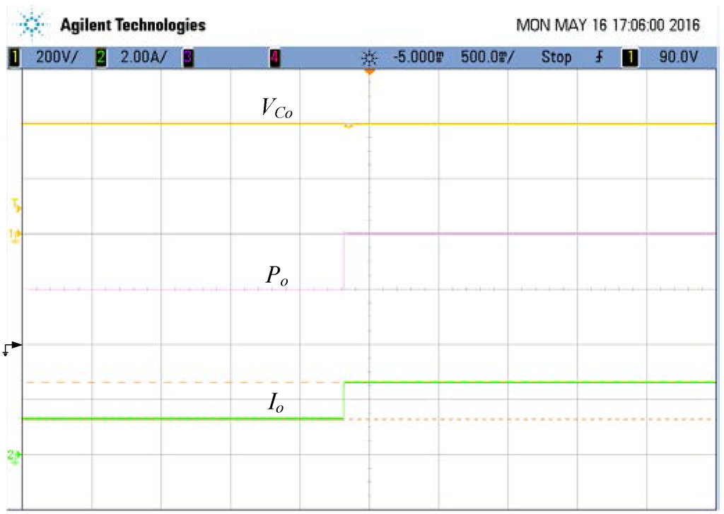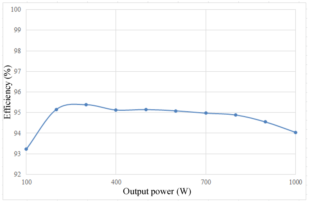 To verify the correctness of the theoretical analysis in this paper, a 1-kW prototype with the specifications summarized in Table 2 is built. The output inductor Lo is designed according to Section 4, which ensures CCM operation while output power is greater than 500 W. In Figure 7, the output power Po is equal to 500 W. It can be seen that the inductor current iLo is twice the switching frequency and in BCM. This experimental measurement of iLo and inductor voltage vLo are identical to the conceptual waveforms depicted in Figure 6. Output power can be increased by enlarging the duty ratios of active switches. At 1-kW output, Figure 8 shows that the control signals vsw,pv and vsw,wind are still in an interleaved pattern but with larger duty ratio than that in Figure 7. In addition, the inductor current iLo is, indeed, in CCM. To examine the voltage and current stresses of the active switch, Figure 9 shows the practical voltage vds,wind and current ids,wind at full load, while vds,pv and ids,pv are shown in Figure 10. The vds,wind and ids,wind stand for the voltage and current of the active switches SW1,wind and SW2,wind, as vds,pv and ids,pv do for SW1,pv and SW2,pv. Figure 11 indicates that the output voltage can be kept at 400 V with the designed inductance, even if one of the renewable power sources shuts down. The DIPWC is able to accomplish a high conversion efficiency. Figure 12 depicts the measured efficiency from light load to full load, in which the peak efficiency is up to 95.4%. The practical measurement of the MPPT result at full load is shown in Figure 13. After MPPT, Figure 14 shows the steady-state output voltage of the PV module, vpv, from which it can be seen that the output voltage fluctuates around a constant. In addition, Figure 15 is the picture of the DIPWC setup.