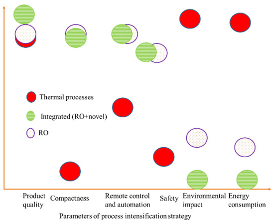 Qualitative analysis of conventional thermal, reverse osmosis (RO), and integrated membrane processes for desalination based on various parameters of PIS (process intensification strategy). y-axis indicates the qualitative comparison of the parameters list along x-axis for different processes (thermal, integrated, RO alone).