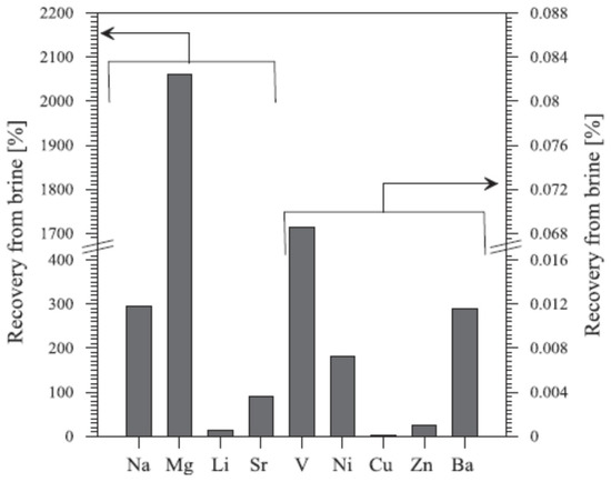 A comparative analysis of potentially recoverable minerals from brine in percentage with respect to their quantity obtained through traditional mining.