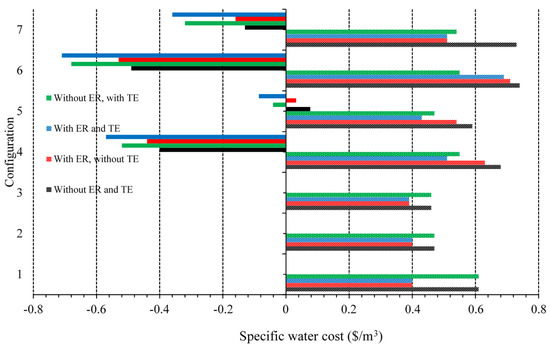 Specific water cost of different integrated configurations without considering sale of salt (patterned bars) and after considering sale of salt (solid lines). ER: Mechanical energy recovery; TE: Thermal energy recovery; MF, Microfiltration; NF, Nanofiltration; MD, membrane distillation; 1 = Configuration 1: RO alone; 2 = Configuration 2: NF-RO; 3 = Configuration 3: MF-NF-RO; 4 = Configuration 4: MF-NF(-MCr)-RO; 5 = Configuration 5: MF-NF-RO(-MCr); 6 = Configuration 6: MF-NF(-MCr)-RO(-MD); 7 = Configuration 7: MF-NF(-MCr)-RO(-MCr).