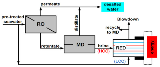 Integrated application of MD with RO and RED (reverse electrodialysis) for water and energy production [26]. HCC and LCC represent High Concentration Compartment and Low Concentration Compartment of the RED cell, respectively.
