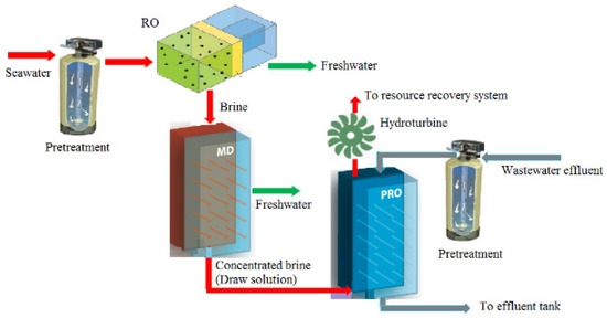 Synergetic effects can be achieved by introducing PRO into desalination systems in terms of reduction of waste footprint of feed solution, and the dilution of the draw solution, which can reduce the energy demand of desalination system and can minimize the environmental consequences of brine disposal. Achili et al. [31] have reported experimental data on a RO unit getting a benefit from pressure generated by a PRO unit. The authors have also reported the power density data of PRO-RO system ranging between 1.1 W/m2 to 2.3 W/m2. The authors have concluded that the proposed system can bring the desalination energy demand down to 1 kWh/m3. In order to increase the power density of the PRO process, Han et al. [30] have proposed the integration of PRO with a closed loop MD process. MD maintains a high concentration of draw solution that extracts freshwater from the feed solution. The authors have claimed that the proposed system can achieve a high recovery factor, huge production of power, and minimum membrane fouling and environmental impacts.