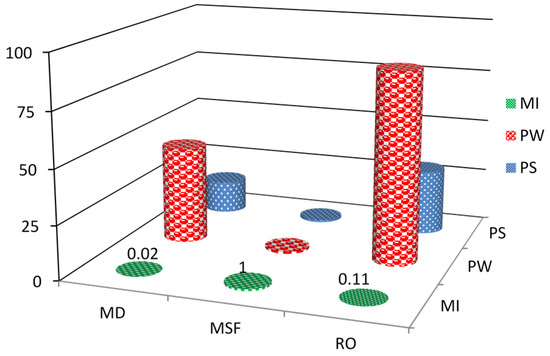 PI (process intensification) metrics for MD, multi stage flash (MSF), and RO. MI, mass intensity; PW, productivity/weight ratio; PS, productivity/size ratio.