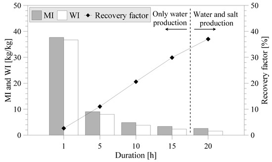 Mass and waste intensities and overall water recovery factor with duration of treatment.