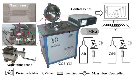 The gas sensing properties of the fabricated planar gas sensor for C2H2 were tested by our gas sensing analysis measurement system, which is made up of an automatic gas distribution equipment and the CGS-1TP intelligent gas sensing analysis system (Elite Technology Co., Ltd., Beijing, China), is shown in Figure 2. This measurement system is convenient for controlling and obtaining the experimental parameters (operating temperature, resistance characteristic, ambient condition, etc.).