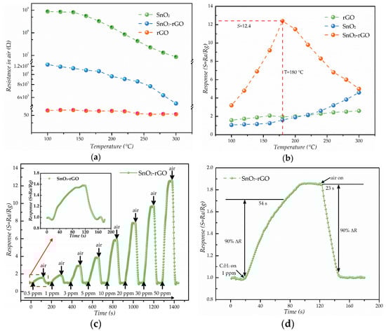 Results of C2H2 gas sensing properties: (a) Resistance of the SnO2, rGO and SnO2–rGO gas sensors at different operating temperatures; (b) Response of the rGO, SnO2 and SnO2–rGO gas sensors to 50 ppm C2H2 gas at different operating temperatures; (c) Response under different gas concentrations from 0.5 ppm to 50 ppm for C2H2 of SnO2–rGO at 180 °C; (d) Dynamic sensing transient of SnO2–rGO sensor to 1 ppm C2H2 gas.