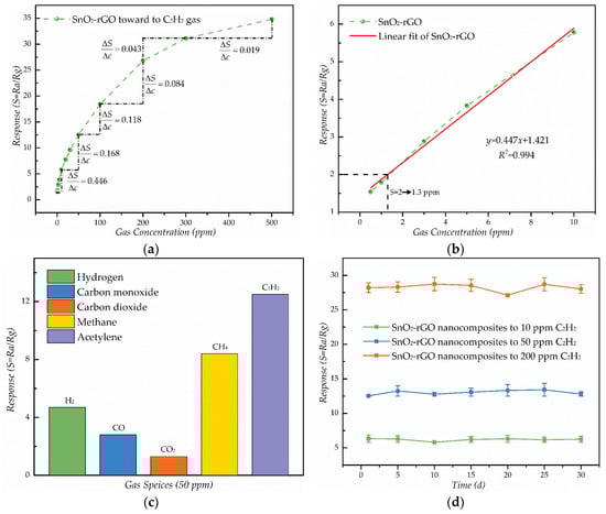 (a) Corresponding response variations of the SnO2–rGO sensor as a function of C2H2 gas concentrations at 180 °C; (b) The limit of detection and the linear relationship between response and concentration; (c) Response of SnO2–rGO gas sensors to 50 ppm different gases (hydrogen, carbon monoxide, carbon dioxide, methane and acetylene) and (d) The stability of SnO2–rGO sensor with respect to 10, 50 and 200 ppm C2H2, respectively.