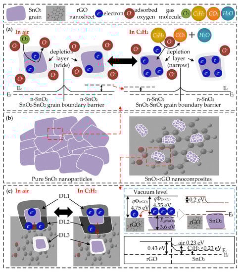 Firstly, the nanostructure of as-synthesized SnO2 grains are composed of nanoparticles, as shown in Figure 8b. The adsorption–desorption model and boundary barrier model are described in Figure 8a. As the SnO2 works as a n-type semiconductor characteristic, when the SnO2 grain is exposed to the air, the O2 molecules in air will adsorbed on the surface of the SnO2 grain to form the adsorbed oxygen ions (O2−, O− or O2−). As the electrons on the surface of SnO2 are captured by O2 molecules, a wide electron depletion layer (DL) is formed. When the SnO2 which contains adsorbed oxygen ions comes into contact with reducing gases, the trapped electrons will release back to the surface of SnO2 and the width of the DL will be reduced. For example, the possible interaction of C2H2 has been proposed in the reference [41] as follows: