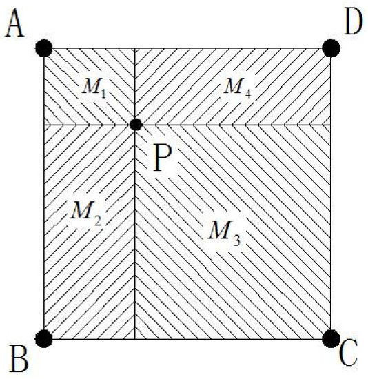 As shown in Figure 2, the weighted value method was used to calculate microcosmic temperature. It is assumed that the centers of macrocosmic nodes are named , , , and , whose temperature are represented respectively by , , , and , while the areas are represented by , , , and , respectively. The temperature of microcosmic node is expressed by