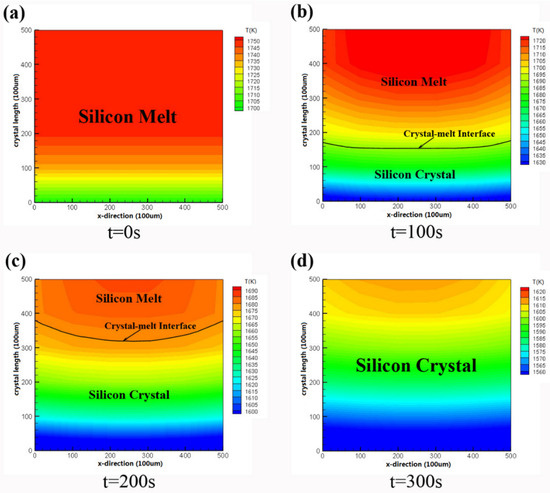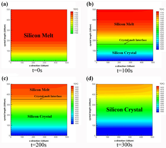 Temperature distribution and crystal-melt interface position with heat transfer coefficient of 100 W·m−2·K−1 at different times: (a) t = 0 s; (b) t = 100 s; (c) t = 200 s; and (d) t = 300 s.