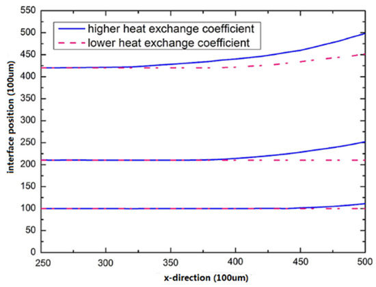 As shown in Figure 3, Figure 4 and Figure 7, in conditions of top adiabatic and bottom constant heat flux, the shape of the crystal-melt interface changes from concave to convex with the decrease of the heat transfer coefficient on the side boundaries. In the industrial production of polycrystalline silicon, the concave crystal-melt interface easily leads to many stresses and dislocations, which reduce the crystal quality. Conversely, the flat or a slightly convex crystal-melt interface can reduce stresses and dislocations [26], so reducing the heat transfer coefficient on side boundaries is necessary to produce high-quality polycrystalline silicon crystal.