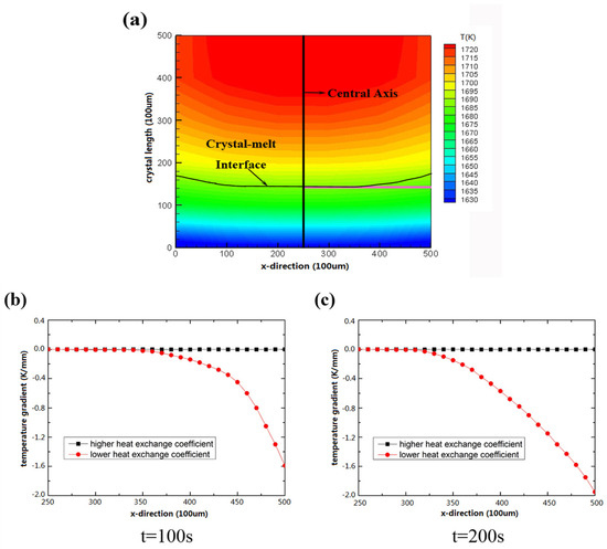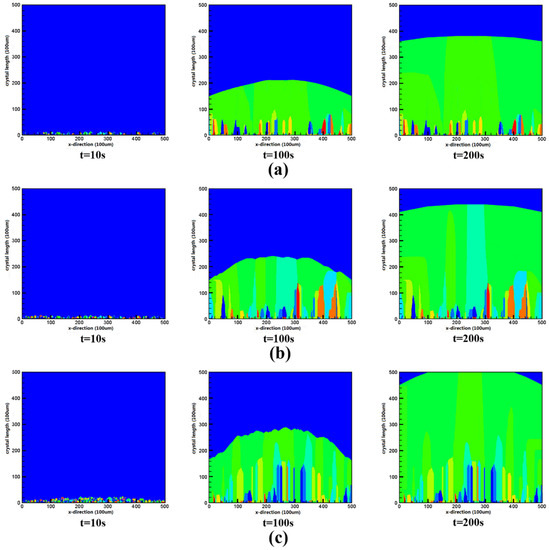 Crystal growth with different heat transfer coefficient at the bottom boundary: (a) 750 W·m−2·K−1; (b) 1000 W·m−2·K−1; and (c) 1250 W·m−2·K−1.