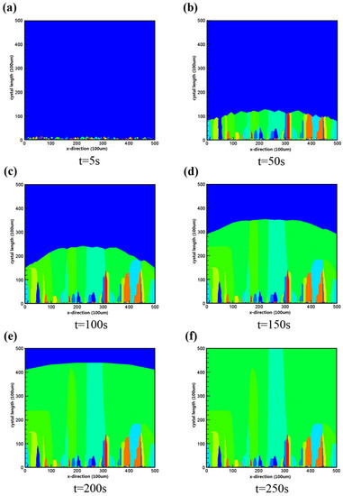 The crystal growth at different times: (a) t = 5 s; (b) t = 50 s; (c) t = 100 s; (d) t = 150 s; (e) t = 200 s; and (f) t = 250 s.