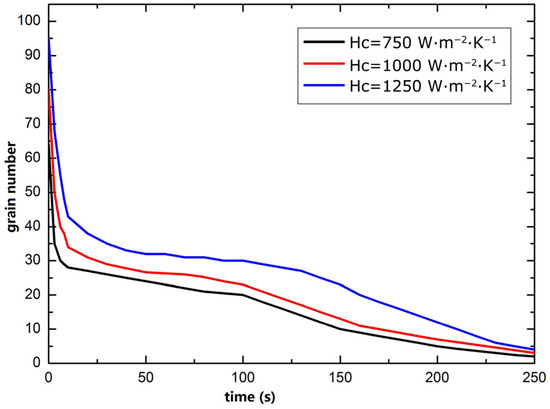 As shown in Figure 8a, at 10 s, the number of nuclei with a lower heat transfer coefficient of 750 W·m−2·K−1 at the bottom boundaries is less than those with a higher heat transfer coefficient. Because the boundary condition is adiabatic on the top and side, the heat exchange via the bottom boundary is the main source for heat transfer. It is not desirable for nucleation at the bottom boundary due to poor heat transfer ability. Therefore, the energy for nucleation is inadequate and a small number of nuclei are formed. Based on this, the heat transfer coefficient at the bottom boundary is increased in order to obtain more nuclei. It can be seen that the number of nuclei increases significantly when the heat transfer coefficient is adjusted to 1000 W·m−2·K−1 and 1250 W·m−2·K−1.