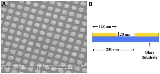 Figure 1. (A) Scanning electron microscope (SEM) picture of the two-dimensional (2D) Au nanostructure (top view); and (B) schematic of the 2D Au nanostructure on a substrate (side view). Reproduced with permission from [43], AIP Publishing, 2006.