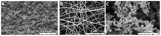 Figure 2. SEM pictures of: carbon nanotubes (CNTs) (A); carbon nanofibers (CNFs) (B); and candle soot carbon nanoparticles (CSNPs) (C). Reproduced with permission from: [55], RSC Publishing, 2015 for (A); [56], AIP Publishing, 2015 for (B); and [57], AIP Publishing, 2015 for (C).
