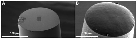 Figure 4. SEM pictures of the fiber-optic laser-generated ultrasound (LGUS) transmitters using: Au nanopores (A); and CNTs-polydimethylsiloxane (CNTs–PDMS) (B). Reproduced with permission from: [59], SPIE, 2013 for (A); and [54], AIP Publishing, 2014 for (B).