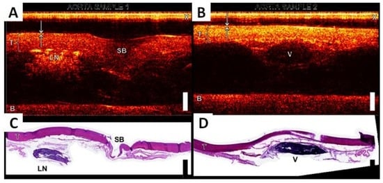 Figure 6. (A,B) All-optical ultrasound imaging (AOUSI) of swine aorta samples with a scale bar of 2 mm. B: the base of the tissue mount; LN: a lymph node; SB: a side branch; T: tunica media; V: a vessel; X: cross-talk. Arrows indicate the reflective layers, which may correspond to the intima. (C,D) The corresponding histology of aorta sections imaged in (A,B), respectively. Reproduced with permission from [77], OSA Publishing, 2015.
