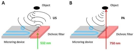 Figure 8. (A) Schematic of ultrasound imaging where the 532-nm laser is absorbed by the dichroic filter. (B) Schematic of photoacoustic imaging where the 750-nm laser passes through the filter for photoacoustic excitation. Reproduced with permission from [102], Elsevier GmbH, 2014.