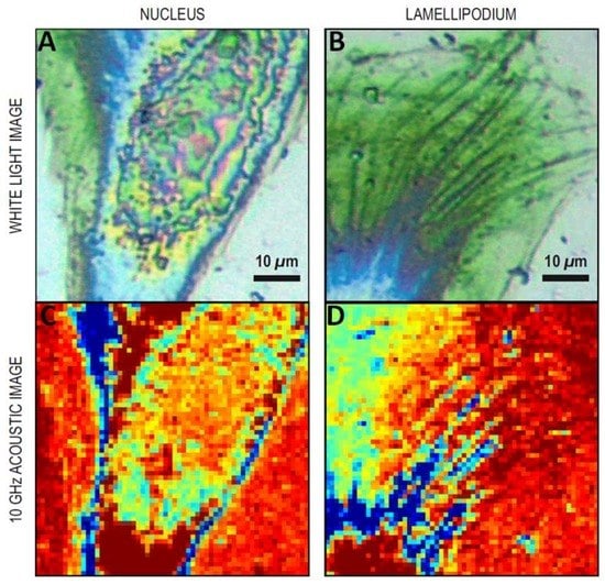 Figure 9. AOUSI cell images (taken at 10 GHz) of: the nuclear region (C); and lamellipodium (D). The upper row shows white-light images of: the nuclear region (A); and lamellipodium (B) for comparison. The scale bar of 10 mm applies to all images. The contour of the cell, the structure of the nucleus and the fine details of the fibrillar lamellipodium are clearly observed by the very high acoustic contrast. Reproduced with permission from [104], Nature Publishing Group, 2015.