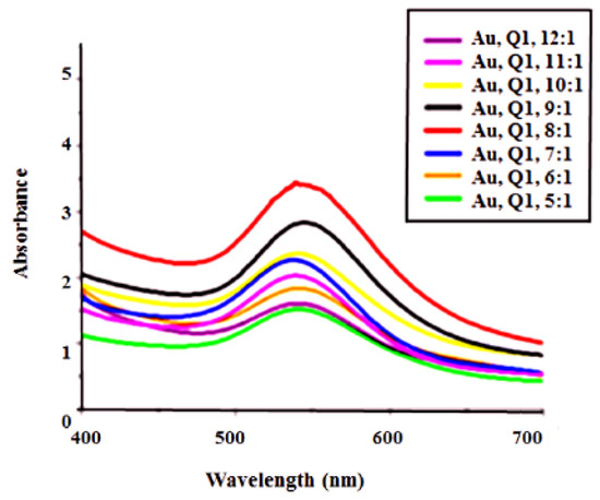 In the UV–visible analysis, the interaction between the ethyl acetate fraction and metal ions was studied for their consistency in surface plasmon resonance properties and gold metal reduction rates by changing the extract ratios. In GNPs, gold ion reduction occurred rapidly within 15 min of the reaction onset, making it one of the fastest bioreducing methods [34,35]. A blue shift was observed from 5:1 to 7:1, which indicates a reduction in the diameter of gold nanoparticles. Reaction optimization occurred at 8:1 ratio of gold and leaf extract, as shown in Figure 1. Synthesized GNPs centered at 543 nm with a 2.84 absorption peak. The surface plasmon resonance greatly depends on the shape, size, and dielectric constant of the metal and the surrounding medium of GNPs [36]. The broad nature of surface plasmon absorption (SPR) peaks indicated the presence of polydispersed GNPs. When the ratio of gold solution was increased from 1 to 8, while keeping the extract concentration constant, no shift in the SPR was observed (Figure 1), however the peak intensity increased, which was due to the development of more GNPs [37]. However, after the 8:1 ratio, a decrease in peak intensity occurred. After the 8:1 ratio of gold and salt, a decrease in absorption confirmed the decomposition of nanoparticles [38].