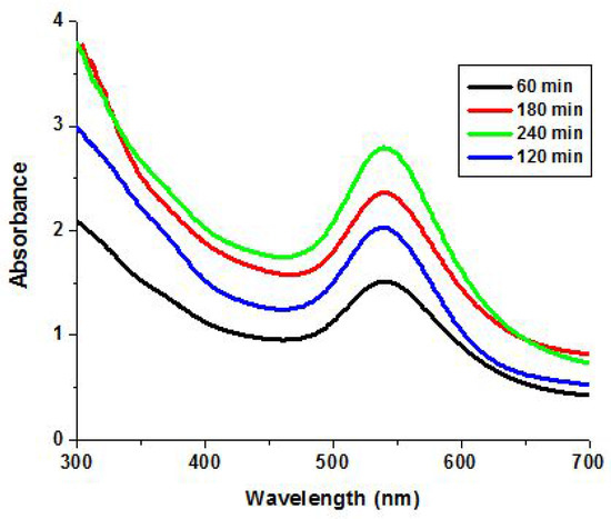 Although gold nanoparticles were synthesized within 15 min of the reaction, complete reduction of Au (III) to Au (0) required maximum 4 h as shown in Figure 2. The characteristic absorption peak for GNPs was found at the wavelength λmax = 543 nm. This peak became more prominent with the passage of time via the complete reduction of gold metal. Over the 4 h reaction period, absorbance steadily increased until the complete reduction of gold metal by plant extract (Figure 2). They might have become stable after 4 h, as no change in absorption occurred. The observed λmax value was characteristic for the surface plasmon resonance peak of GNPs, which was due to the collective oscillation of free conduction electrons of GNPs in resonance induced by the interacting electromagnetic field [37,39].