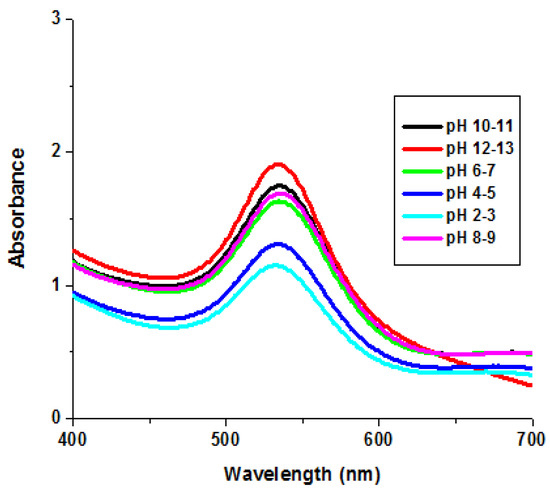 pH plays an important role in controlling nanoparticle size by affecting the surface charge stability and particle interaction. A digital pH meter (model 510, Oakton, Eutech, Vernon Hills, IL, USA) was used for the pH measurements of gold nanoparticles. To check the pH effect, acidic (HCl) and alkaline (NaOH) solutions were prepared and added to nanoparticles solution. This solution was kept for 2 days, and their stability was checked by observing absorption on a UV–visible spectrophotometer. The cleared solution and UV results supported the stability of nanoparticles at all pH values (Figure 4).